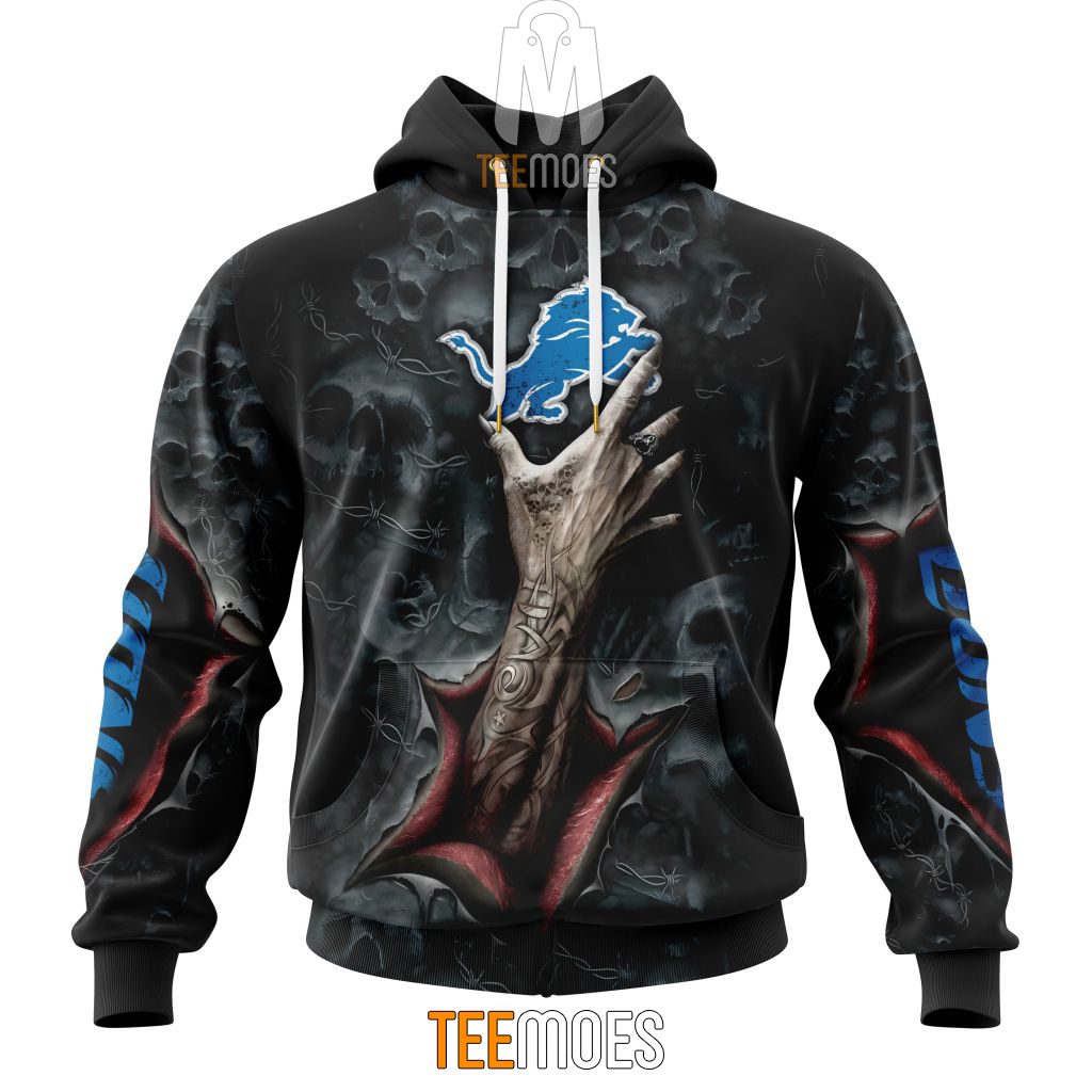 NFL Detroit Lions Halloween Horror Skull Pullover Hoodie Product Features Along with its Detroit Lions graphics, this cozy pullover hoodie features super-soft midweight material. Material: 95% polyester + 5% spandex. The fabric is durable and resistant to wrinkles, shrinking and mildew. Hood with drawstrings. Long sleeve. Front pouch pocket. Midweight hoodie suitable for moderate temperatures....