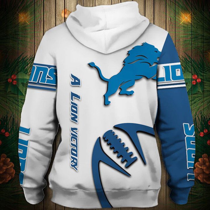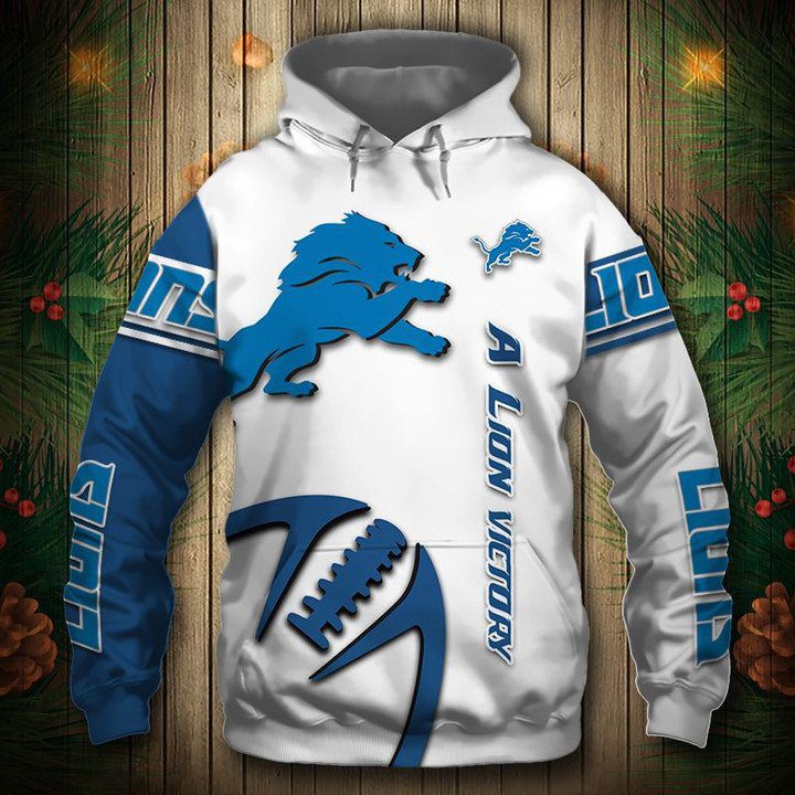 NFL Detroit Lions White Blue Pullover Hoodie V2 Product Features Along with its Detroit Lions graphics, this cozy pullover hoodie features super-soft midweight material. Material: 95% polyester + 5% spandex. The fabric is durable and resistant to wrinkles, shrinking and mildew. Hood with drawstrings. Long sleeve. Front pouch pocket. Midweight hoodie suitable for moderate temperatures....