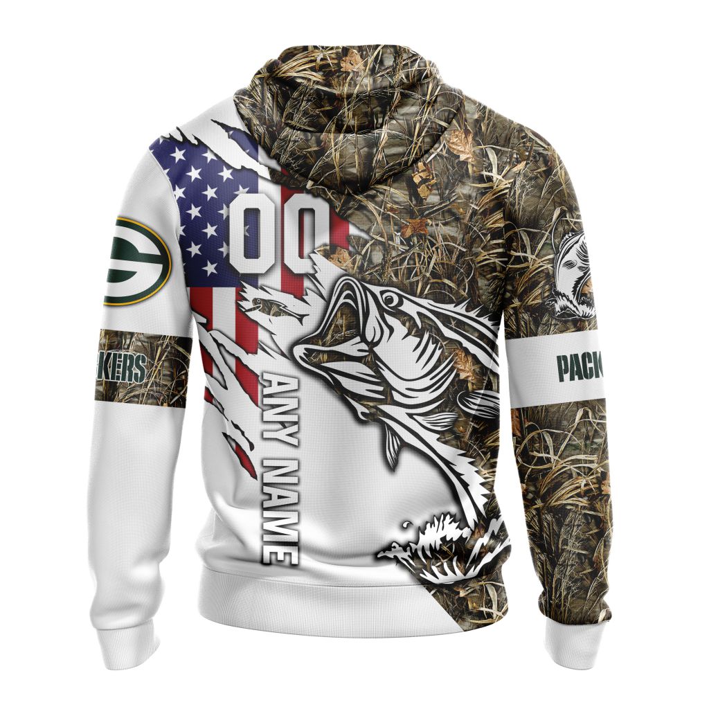 NFL Green Bay Packers Custom Name Number Fishing With Flag Of USA Pullover Hoodie Product Features Along with its Green Bay Packers graphics, this cozy pullover hoodie features super-soft midweight material. Material: 95% polyester + 5% spandex. The fabric is durable and resistant to wrinkles, shrinking and mildew. Hood with drawstrings. Long sleeve. Front pouch...