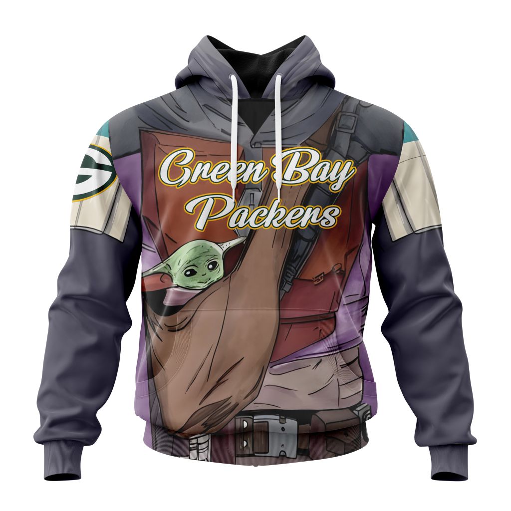 NFL Green Bay Packers Custom Name Number Mandalorian And Baby Yoda Pullover Hoodie Product Features Along with its Green Bay Packers graphics, this cozy pullover hoodie features super-soft midweight material. Material: 95% polyester + 5% spandex. The fabric is durable and resistant to wrinkles, shrinking and mildew. Hood with drawstrings. Long sleeve. Front pouch pocket....