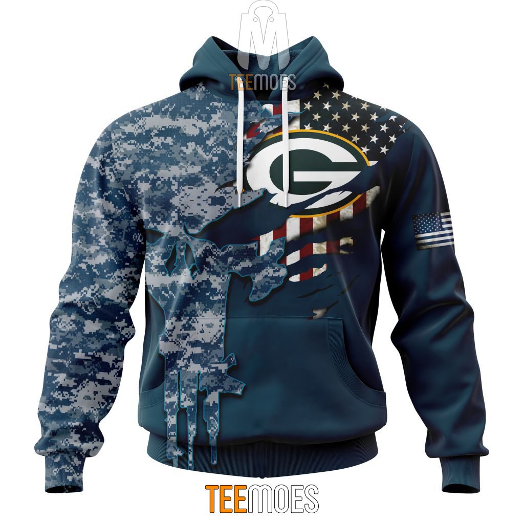 NFL Green Bay Packers Custom Name Number Navy Skull Camo Veteran Pullover Hoodie Product Features Along with its Green Bay Packers graphics, this cozy pullover hoodie features super-soft midweight material. Material: 95% polyester + 5% spandex. The fabric is durable and resistant to wrinkles, shrinking and mildew. Hood with drawstrings. Long sleeve. Front pouch pocket....