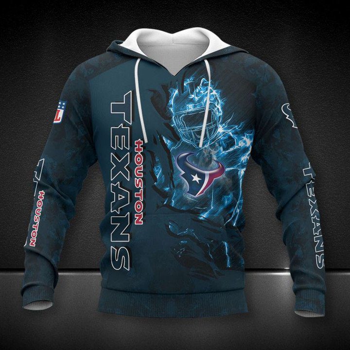 NFL Houston Texans Blue Camo Pullover Hoodie Product Features Along with its Houston Texans graphics, this cozy pullover hoodie features super-soft midweight material. Material: 95% polyester + 5% spandex. The fabric is durable and resistant to wrinkles, shrinking and mildew. Hood with drawstrings. Long sleeve. Front pouch pocket. Midweight hoodie suitable for moderate temperatures. Features...