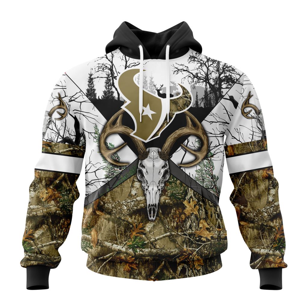 NFL Houston Texans Custom Name Number Deer Skull And Forest Pullover Hoodie Product Features Along with its Houston Texans graphics, this cozy pullover hoodie features super-soft midweight material. Material: 95% polyester + 5% spandex. The fabric is durable and resistant to wrinkles, shrinking and mildew. Hood with drawstrings. Long sleeve. Front pouch pocket. Midweight hoodie...