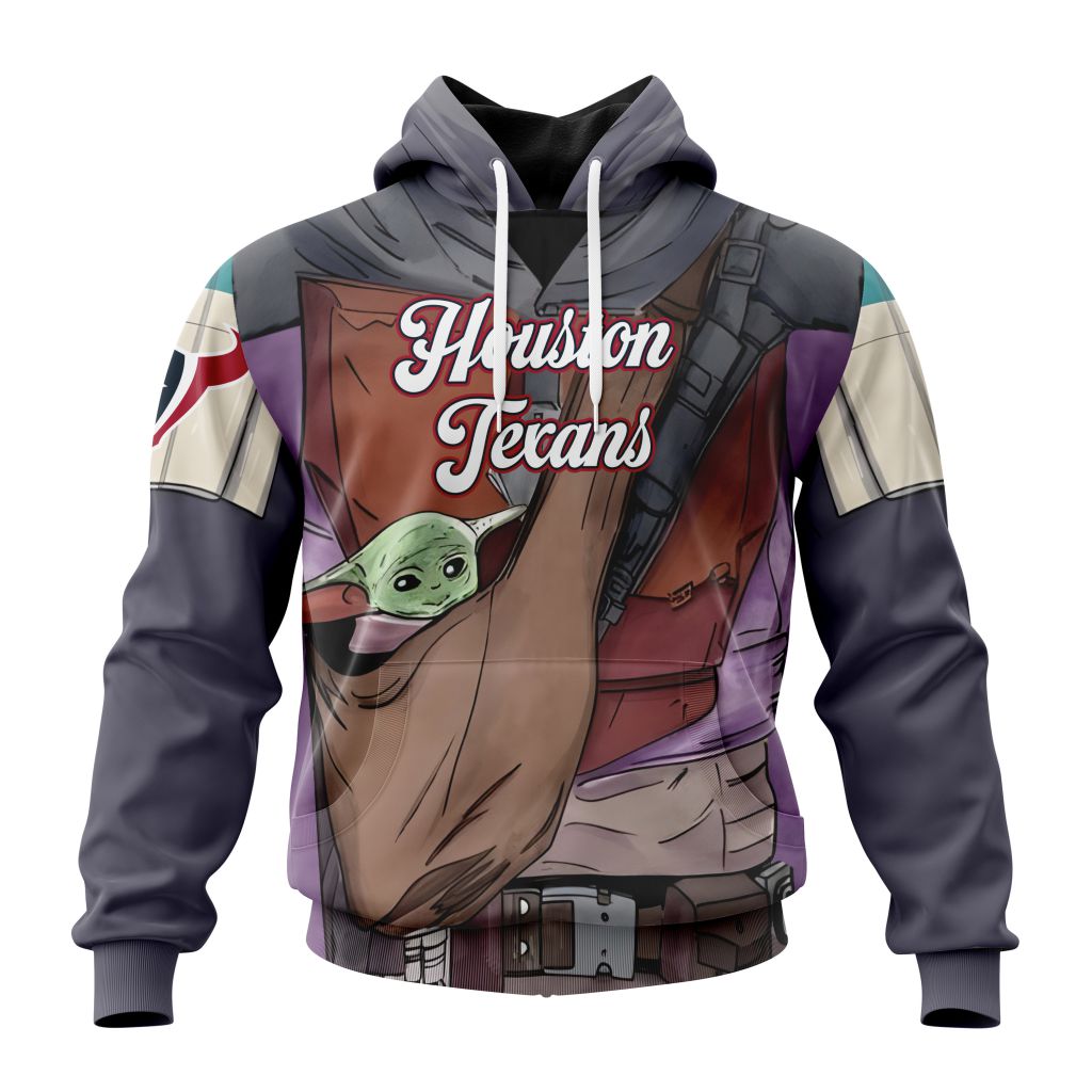 NFL Houston Texans Custom Name Number Mandalorian And Baby Yoda Pullover Hoodie Product Features Along with its Houston Texans graphics, this cozy pullover hoodie features super-soft midweight material. Material: 95% polyester + 5% spandex. The fabric is durable and resistant to wrinkles, shrinking and mildew. Hood with drawstrings. Long sleeve. Front pouch pocket. Midweight hoodie...