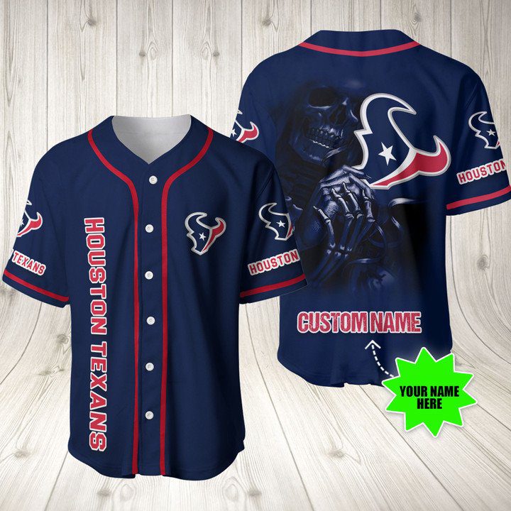 NFL Houston Texans Custom Name Skull Blue Baseball Jersey Product Features This Houston Texans Baseball Jersey is not only sturdy and durable for long hours of exercising, but also breathable and moisture-wicking to keep you snug all day. Breathable fabric: This Baseball Jersey is made of woven fabric, with moisture-wicking features and a comfortable feel...