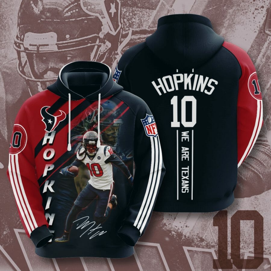 NFL Houston Texans DeAndre Hopkins Deep Steel Blue Battle Red Stripes Pullover Hoodie Product Features Along with its Houston Texans graphics, this cozy pullover hoodie features super-soft midweight material. Material: 95% polyester + 5% spandex. The fabric is durable and resistant to wrinkles, shrinking and mildew. Hood with drawstrings. Long sleeve. Front pouch pocket. Midweight...