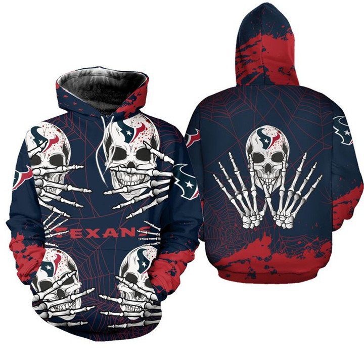 NFL Houston Texans Halloween Skull Pullover Hoodie V2 Product Features Along with its Houston Texans graphics, this cozy pullover hoodie features super-soft midweight material. Material: 95% polyester + 5% spandex. The fabric is durable and resistant to wrinkles, shrinking and mildew. Hood with drawstrings. Long sleeve. Front pouch pocket. Midweight hoodie suitable for moderate temperatures....