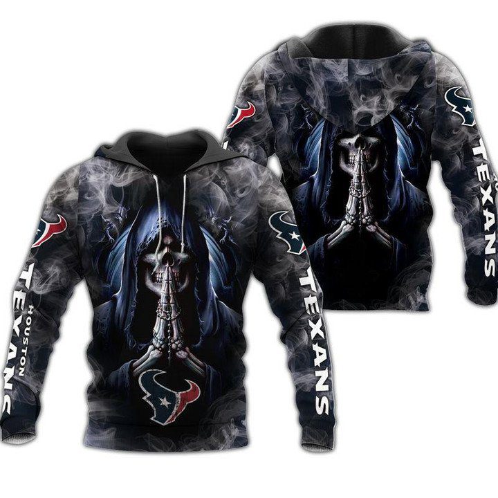 NFL Houston Texans Skull Smoke Pullover Hoodie Product Features Along with its Houston Texans graphics, this cozy pullover hoodie features super-soft midweight material. Material: 95% polyester + 5% spandex. The fabric is durable and resistant to wrinkles, shrinking and mildew. Hood with drawstrings. Long sleeve. Front pouch pocket. Midweight hoodie suitable for moderate temperatures. Features...