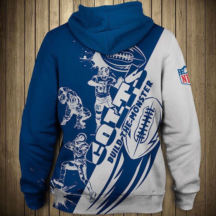 NFL Indianapolis Colts Blue White Pullover Hoodie V3 Product Features Along with its Indianapolis Colts graphics, this cozy pullover hoodie features super-soft midweight material. Material: 95% polyester + 5% spandex. The fabric is durable and resistant to wrinkles, shrinking and mildew. Hood with drawstrings. Long sleeve. Front pouch pocket. Midweight hoodie suitable for moderate temperatures....