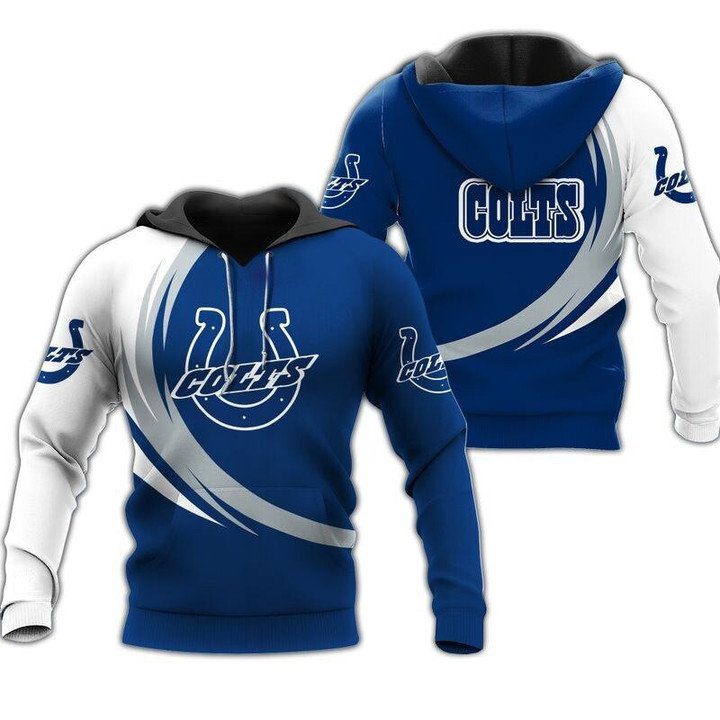 NFL Indianapolis Colts Blue White Pullover Hoodie V7 Product Features Along with its Indianapolis Colts graphics, this cozy pullover hoodie features super-soft midweight material. Material: 95% polyester + 5% spandex. The fabric is durable and resistant to wrinkles, shrinking and mildew. Hood with drawstrings. Long sleeve. Front pouch pocket. Midweight hoodie suitable for moderate temperatures....