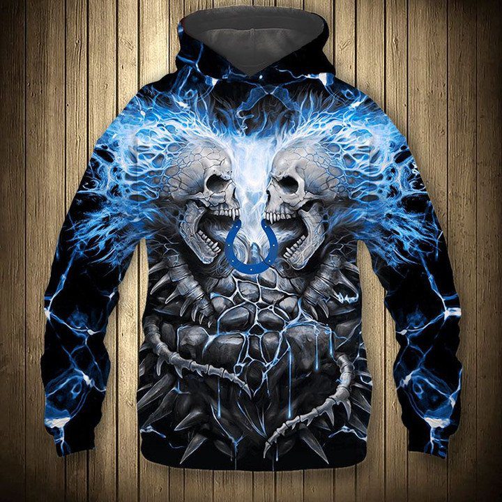NFL Indianapolis Colts Skull Black Pullover Hoodie Product Features Along with its Indianapolis Colts graphics, this cozy pullover hoodie features super-soft midweight material. Material: 95% polyester + 5% spandex. The fabric is durable and resistant to wrinkles, shrinking and mildew. Hood with drawstrings. Long sleeve. Front pouch pocket. Midweight hoodie suitable for moderate temperatures. Features...