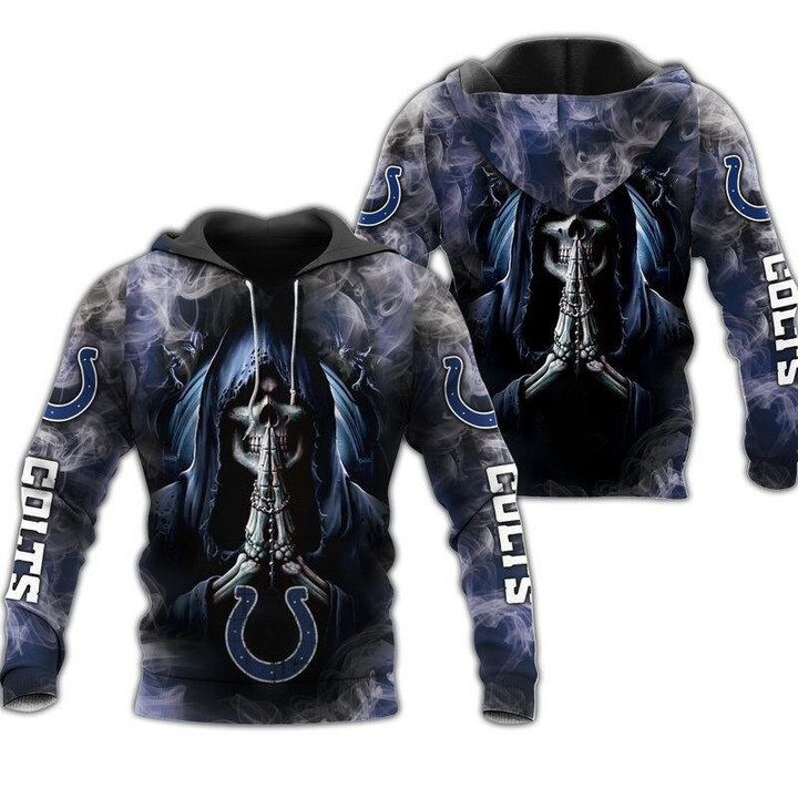 NFL Indianapolis Colts Skull Smoke Pullover Hoodie Product Features Along with its Indianapolis Colts graphics, this cozy pullover hoodie features super-soft midweight material. Material: 95% polyester + 5% spandex. The fabric is durable and resistant to wrinkles, shrinking and mildew. Hood with drawstrings. Long sleeve. Front pouch pocket. Midweight hoodie suitable for moderate temperatures. Features...
