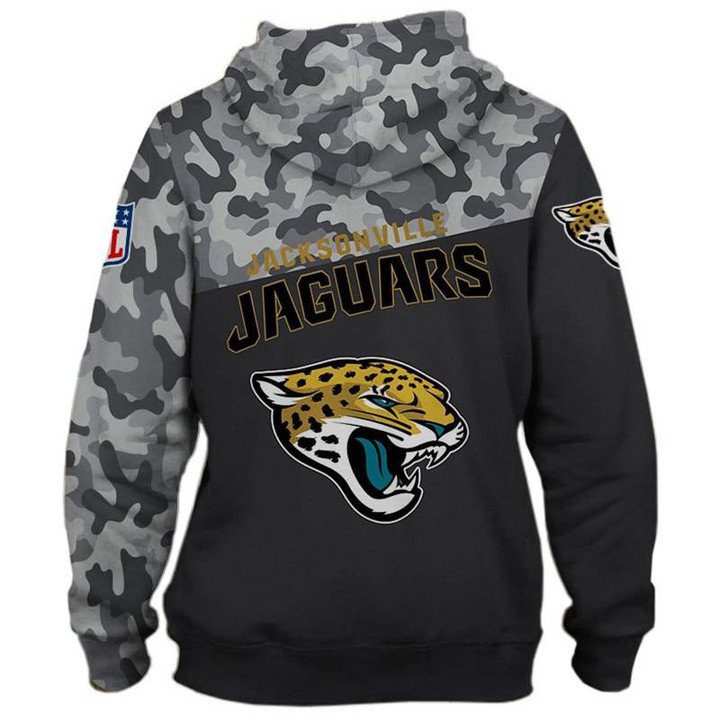 NFL Jacksonville Jaguars Black Camo Pullover Hoodie Product Features Along with its Jacksonville Jaguars graphics, this cozy pullover hoodie features super-soft midweight material. Material: 95% polyester + 5% spandex. The fabric is durable and resistant to wrinkles, shrinking and mildew. Hood with drawstrings. Long sleeve. Front pouch pocket. Midweight hoodie suitable for moderate temperatures. Features...
