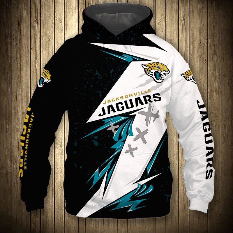 NFL Jacksonville Jaguars Black White Thunder Pullover Hoodie Product Features Along with its Jacksonville Jaguars graphics, this cozy pullover hoodie features super-soft midweight material. Material: 95% polyester + 5% spandex. The fabric is durable and resistant to wrinkles, shrinking and mildew. Hood with drawstrings. Long sleeve. Front pouch pocket. Midweight hoodie suitable for moderate temperatures....