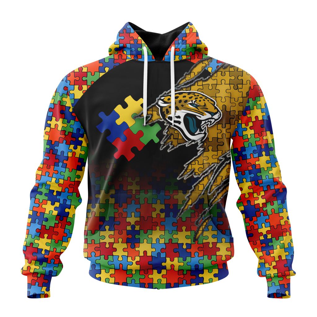 NFL Jacksonville Jaguars Custom Name Number Autism Awareness Design Pullover Hoodie Product Features Along with its Jacksonville Jaguars graphics, this cozy pullover hoodie features super-soft midweight material. Material: 95% polyester + 5% spandex. The fabric is durable and resistant to wrinkles, shrinking and mildew. Hood with drawstrings. Long sleeve. Front pouch pocket. Midweight hoodie suitable...