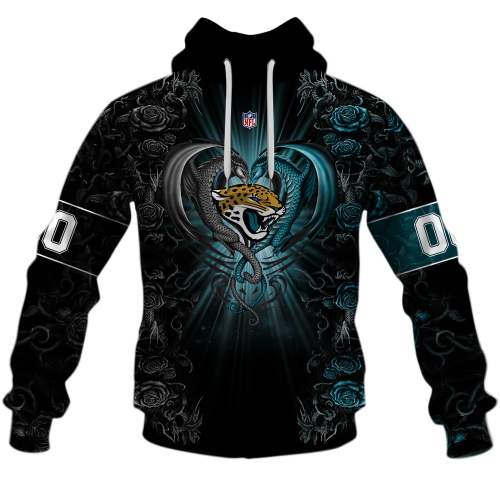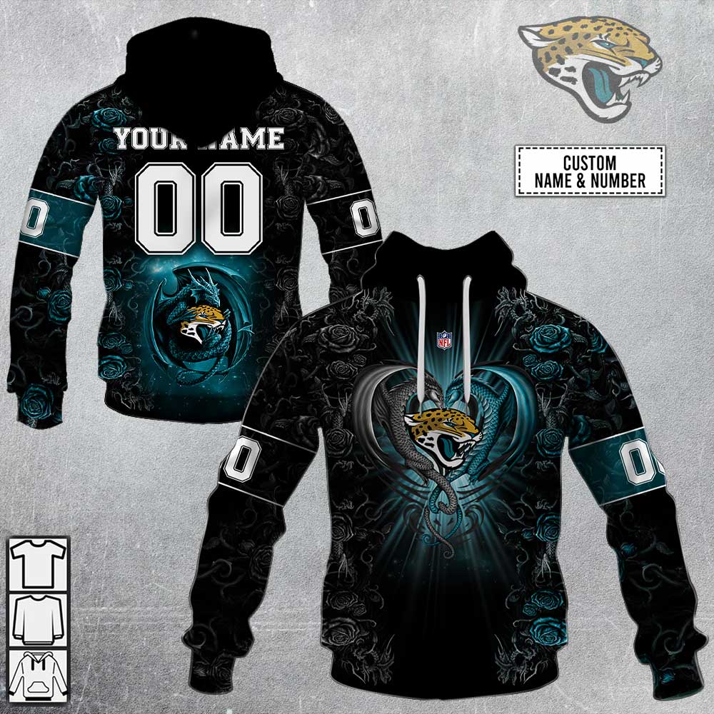 NFL Jacksonville Jaguars Custom Name Number Rose Dragon Pullover Hoodie Product Features Along with its Jacksonville Jaguars graphics, this cozy pullover hoodie features super-soft midweight material. Material: 95% polyester + 5% spandex. The fabric is durable and resistant to wrinkles, shrinking and mildew. Hood with drawstrings. Long sleeve. Front pouch pocket. Midweight hoodie suitable for...