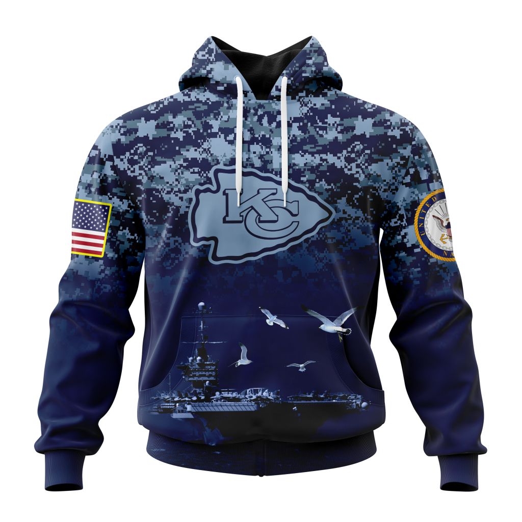 NFL Kansas City Chiefs Custom Name Number Honor US Navy Veterans Pullover Hoodie Product Features Along with its Kansas City Chiefs graphics, this cozy pullover hoodie features super-soft midweight material. Material: 95% polyester + 5% spandex. The fabric is durable and resistant to wrinkles, shrinking and mildew. Hood with drawstrings. Long sleeve. Front pouch pocket....