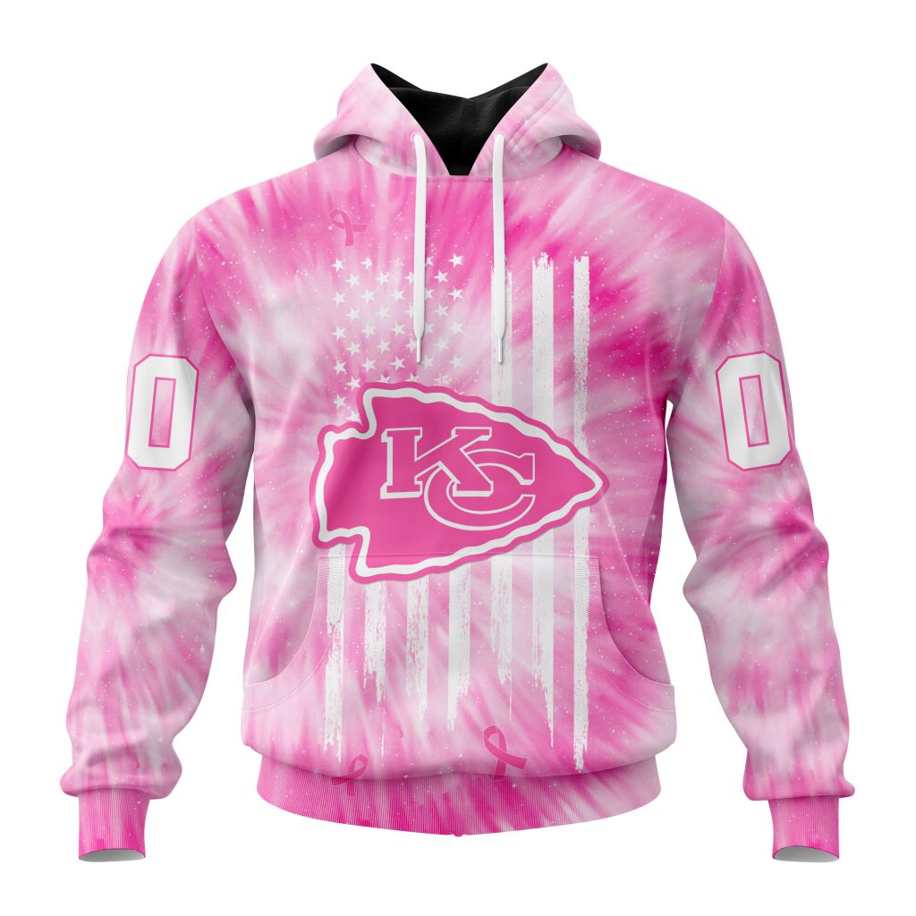 NFL Kansas City Chiefs Custom Name Number Pink Tie-Dye Pullover Hoodie Product Features Along with its Kansas City Chiefs graphics, this cozy pullover hoodie features super-soft midweight material. Material: 95% polyester + 5% spandex. The fabric is durable and resistant to wrinkles, shrinking and mildew. Hood with drawstrings. Long sleeve. Front pouch pocket. Midweight hoodie...