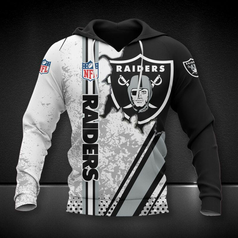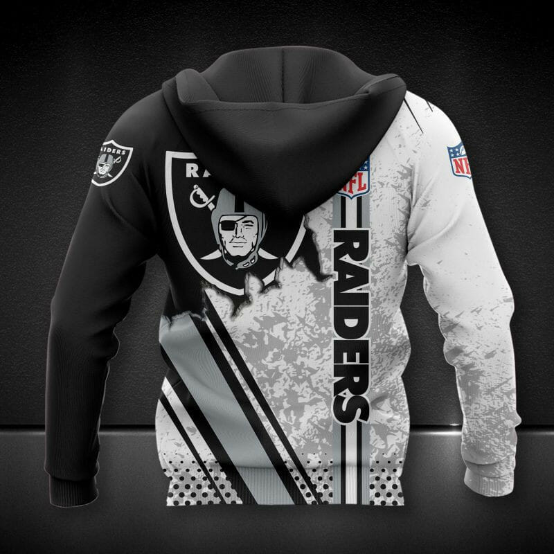 NFL Las Vegas Raiders Black White Pullover Hoodie V2 Product Features Along with its Las Vegas Raiders graphics, this cozy pullover hoodie features super-soft midweight material. Material: 95% polyester + 5% spandex. The fabric is durable and resistant to wrinkles, shrinking and mildew. Hood with drawstrings. Long sleeve. Front pouch pocket. Midweight hoodie suitable for...
