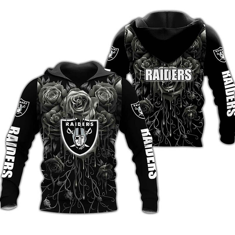 NFL Las Vegas Raiders Silver Rose Black Pullover Hoodie Product Features Along with its Las Vegas Raiders graphics, this cozy pullover hoodie features super-soft midweight material. Material: 95% polyester + 5% spandex. The fabric is durable and resistant to wrinkles, shrinking and mildew. Hood with drawstrings. Long sleeve. Front pouch pocket. Midweight hoodie suitable for...