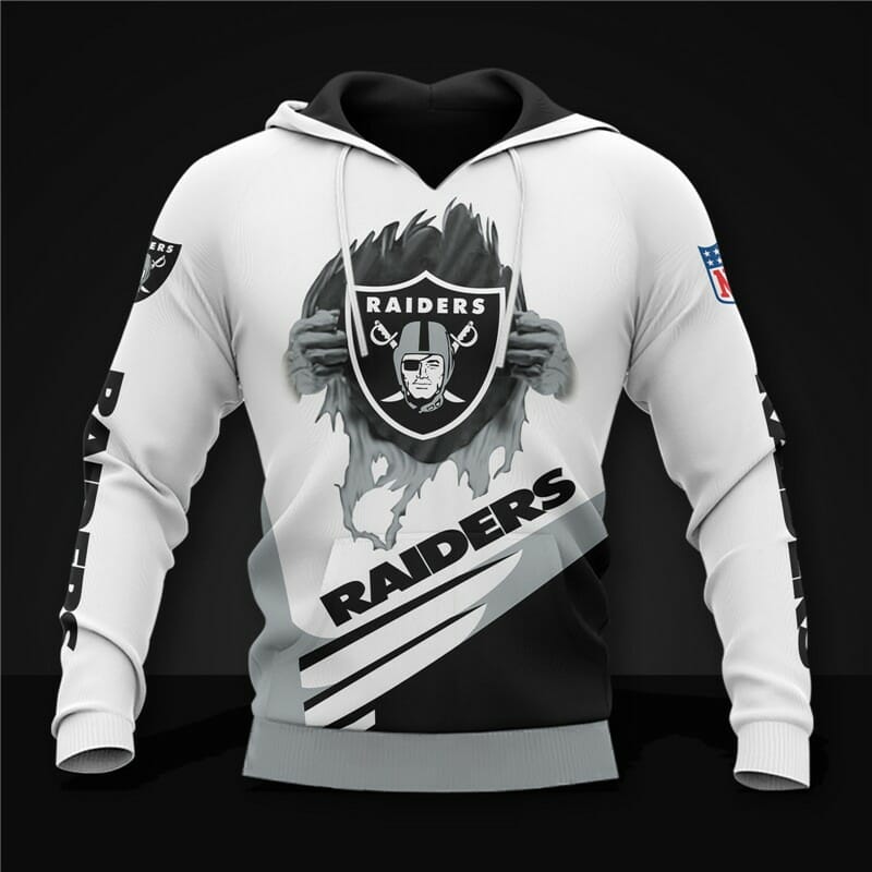 NFL Las Vegas Raiders White Black Pullover Hoodie Product Features Along with its Las Vegas Raiders graphics, this cozy pullover hoodie features super-soft midweight material. Material: 95% polyester + 5% spandex. The fabric is durable and resistant to wrinkles, shrinking and mildew. Hood with drawstrings. Long sleeve. Front pouch pocket. Midweight hoodie suitable for moderate...