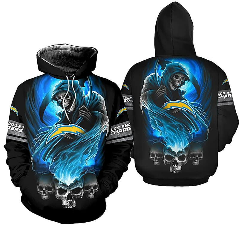 NFL Los Angeles Chargers Black Blue Skull Pullover Hoodie V8 Product Features Along with its Los Angeles Chargers graphics, this cozy pullover hoodie features super-soft midweight material. Material: 95% polyester + 5% spandex. The fabric is durable and resistant to wrinkles, shrinking and mildew. Hood with drawstrings. Long sleeve. Front pouch pocket. Midweight hoodie suitable...