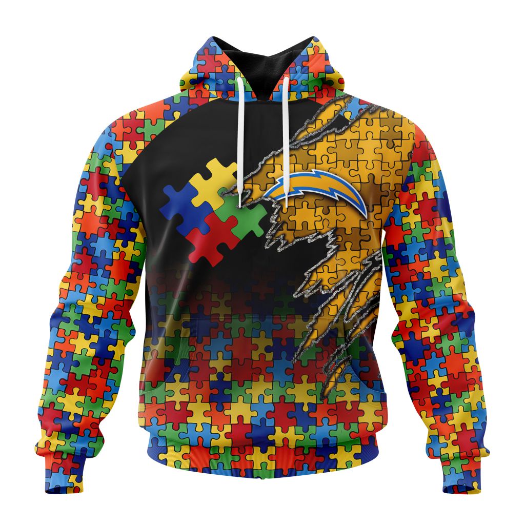 NFL Los Angeles Chargers Custom Name Number Autism Awareness Design Pullover Hoodie Product Features Along with its Los Angeles Chargers graphics, this cozy pullover hoodie features super-soft midweight material. Material: 95% polyester + 5% spandex. The fabric is durable and resistant to wrinkles, shrinking and mildew. Hood with drawstrings. Long sleeve. Front pouch pocket. Midweight...