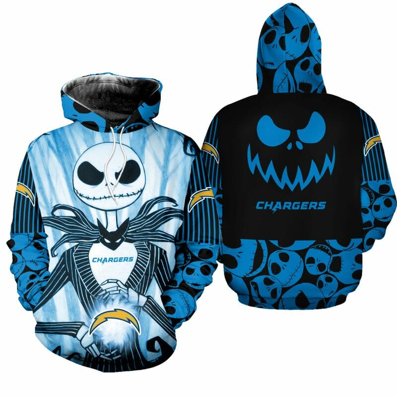 NFL Los Angeles Chargers Jack Skellington Pullover Hoodie V4 Product Features Along with its Los Angeles Chargers graphics, this cozy pullover hoodie features super-soft midweight material. Material: 95% polyester + 5% spandex. The fabric is durable and resistant to wrinkles, shrinking and mildew. Hood with drawstrings. Long sleeve. Front pouch pocket. Midweight hoodie suitable for...