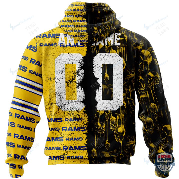 NFL Los Angeles Rams Custom Name Number Black Yellow Skull Pullover Hoodie Product Features Along with its Los Angeles Rams graphics, this cozy pullover hoodie features super-soft midweight material. Material: 95% polyester + 5% spandex. The fabric is durable and resistant to wrinkles, shrinking and mildew. Hood with drawstrings. Long sleeve. Front pouch pocket. Midweight...