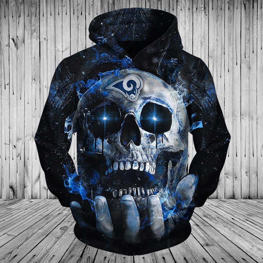NFL Los Angeles Rams Horror Black Skull Pullover Hoodie Product Features Along with its Los Angeles Rams graphics, this cozy pullover hoodie features super-soft midweight material. Material: 95% polyester + 5% spandex. The fabric is durable and resistant to wrinkles, shrinking and mildew. Hood with drawstrings. Long sleeve. Front pouch pocket. Midweight hoodie suitable for...