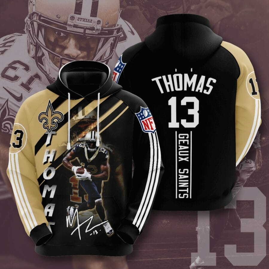 NFL New Orleans Saints Michael Thomas Old Gold Black Pullover Hoodie Product Features Along with its New Orleans Saints graphics, this cozy pullover hoodie features super-soft midweight material. Material: 95% polyester + 5% spandex. The fabric is durable and resistant to wrinkles, shrinking and mildew. Hood with drawstrings. Long sleeve. Front pouch pocket. Midweight hoodie...