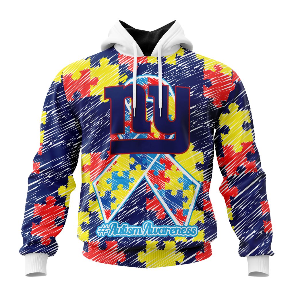 NFL New York Giants Custom Name Number Puzzle Autism Awareness Pullover Hoodie Product Features Along with its New York Giants graphics, this cozy pullover hoodie features super-soft midweight material. Material: 95% polyester + 5% spandex. The fabric is durable and resistant to wrinkles, shrinking and mildew. Hood with drawstrings. Long sleeve. Front pouch pocket. Midweight...