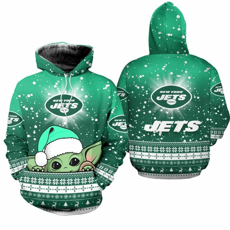 NFL New York Jets Baby Yoda Christmas Pullover Hoodie Product Features Along with its New York Jets graphics, this cozy pullover hoodie features super-soft midweight material. Material: 95% polyester + 5% spandex. The fabric is durable and resistant to wrinkles, shrinking and mildew. Hood with drawstrings. Long sleeve. Front pouch pocket. Midweight hoodie suitable for...