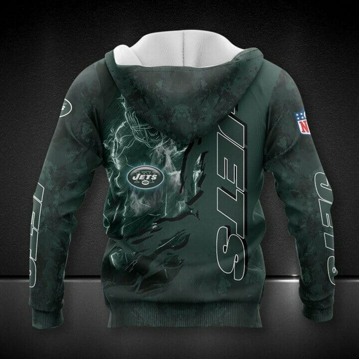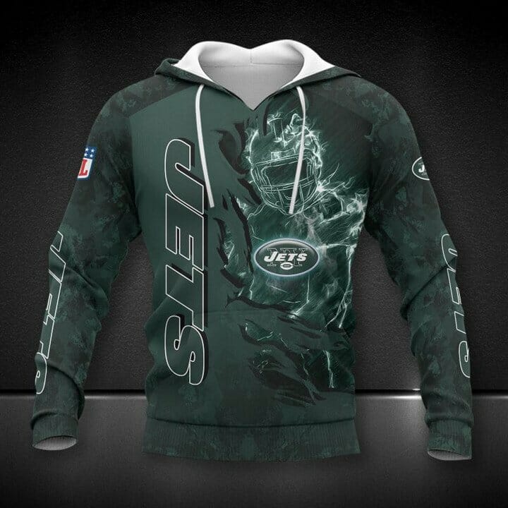 NFL New York Jets Green Pullover Hoodie Product Features Along with its New York Jets graphics, this cozy pullover hoodie features super-soft midweight material. Material: 95% polyester + 5% spandex. The fabric is durable and resistant to wrinkles, shrinking and mildew. Hood with drawstrings. Long sleeve. Front pouch pocket. Midweight hoodie suitable for moderate temperatures....