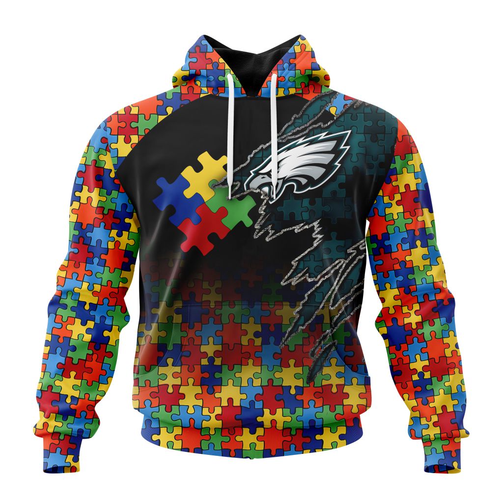 NFL Philadelphia Eagles Custom Name Number Autism Awareness Design Pullover Hoodie Product Features Along with its Philadelphia Eagles graphics, this cozy pullover hoodie features super-soft midweight material. Material: 95% polyester + 5% spandex. The fabric is durable and resistant to wrinkles, shrinking and mildew. Hood with drawstrings. Long sleeve. Front pouch pocket. Midweight hoodie suitable...