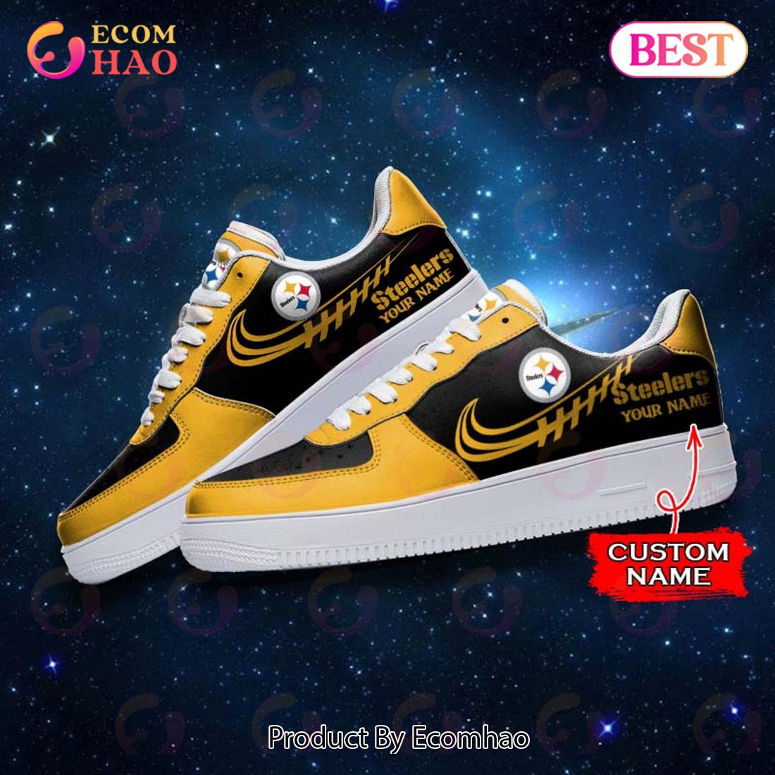NFL Pittsburgh Steelers Air Force 1 Sneaker Custom Name Take your fandom for the Pittsburgh Steelers up a notch with our customized Air Force 1 sneakers! Featuring the iconic black and gold Pittsburgh Steelers logo and custom-made with your name or favorite player’s name, these shoes are perfect for showing your hometown pride. With eye-catching...