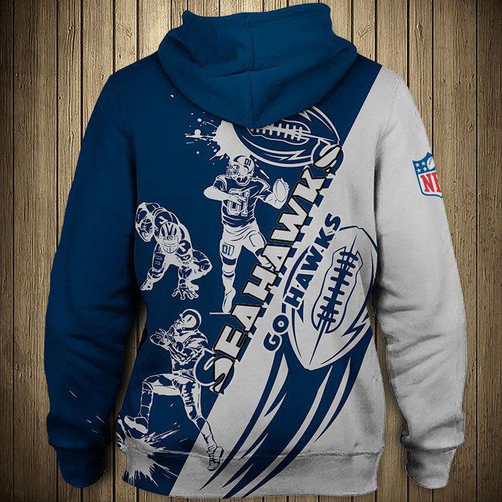 NFL Seattle Seahawks Grey Navy Pullover Hoodie V2 Product Features Along with its Seattle Seahawks graphics, this cozy pullover hoodie features super-soft midweight material. Material: 95% polyester + 5% spandex. The fabric is durable and resistant to wrinkles, shrinking and mildew. Hood with drawstrings. Long sleeve. Front pouch pocket. Midweight hoodie suitable for moderate temperatures....