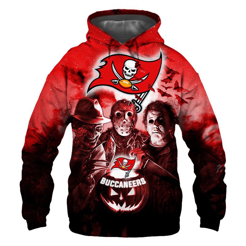 NFL Tampa Bay Buccaneers Halloween Night Pullover Hoodie Product Features Along with its Tampa Bay Buccaneers graphics, this cozy pullover hoodie features super-soft midweight material. Material: 95% polyester + 5% spandex. The fabric is durable and resistant to wrinkles, shrinking and mildew. Hood with drawstrings. Long sleeve. Front pouch pocket. Midweight hoodie suitable for moderate...