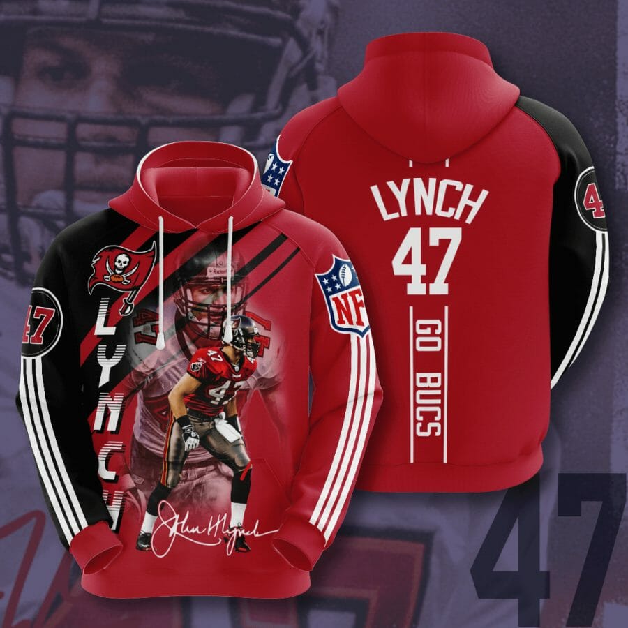 NFL Tampa Bay Buccaneers John Lynch Red Black Pullover Hoodie Product Features Along with its Tampa Bay Buccaneers graphics, this cozy pullover hoodie features super-soft midweight material. Material: 95% polyester + 5% spandex. The fabric is durable and resistant to wrinkles, shrinking and mildew. Hood with drawstrings. Long sleeve. Front pouch pocket. Midweight hoodie suitable...