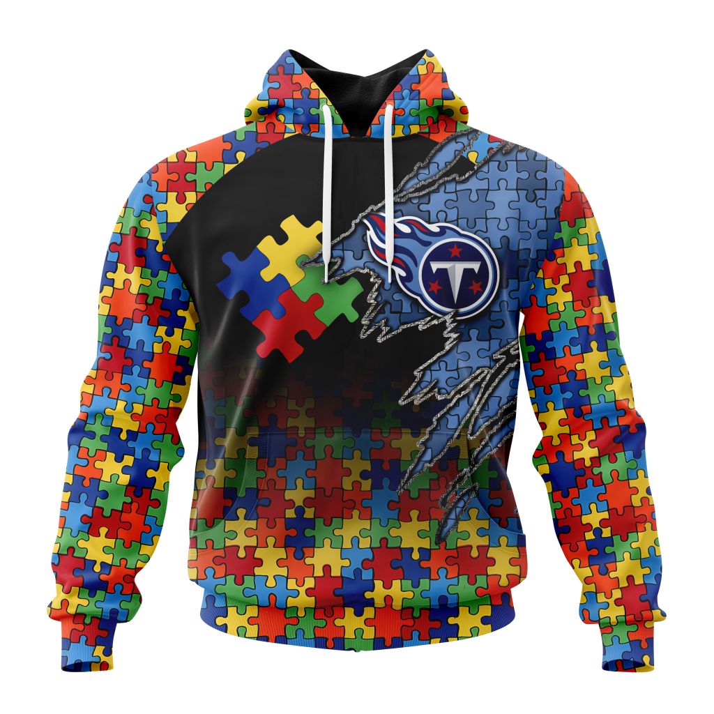 NFL Tennessee Titans Custom Name Number Autism Awareness Design Pullover Hoodie Product Features Along with its Tennessee Titans graphics, this cozy pullover hoodie features super-soft midweight material. Material: 95% polyester + 5% spandex. The fabric is durable and resistant to wrinkles, shrinking and mildew. Hood with drawstrings. Long sleeve. Front pouch pocket. Midweight hoodie suitable...