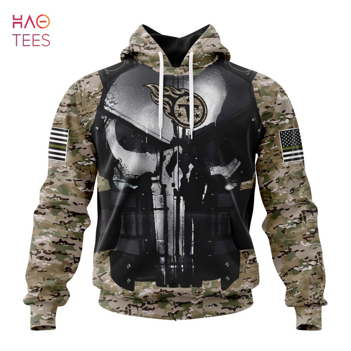 NFL Tennessee Titans Custom Name Number Punisher Skull Pullover Hoodie Product Features Along with its Tennessee Titans graphics, this cozy pullover hoodie features super-soft midweight material. Material: 95% polyester + 5% spandex. The fabric is durable and resistant to wrinkles, shrinking and mildew. Hood with drawstrings. Long sleeve. Front pouch pocket. Midweight hoodie suitable for...