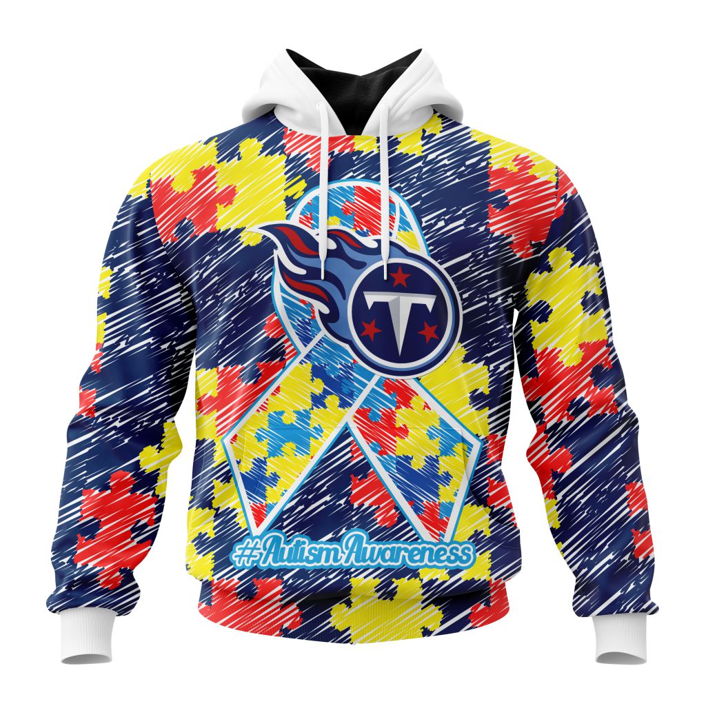 NFL Tennessee Titans Custom Name Number Puzzle Autism Awareness Pullover Hoodie Product Features Along with its Tennessee Titans graphics, this cozy pullover hoodie features super-soft midweight material. Material: 95% polyester + 5% spandex. The fabric is durable and resistant to wrinkles, shrinking and mildew. Hood with drawstrings. Long sleeve. Front pouch pocket. Midweight hoodie suitable...