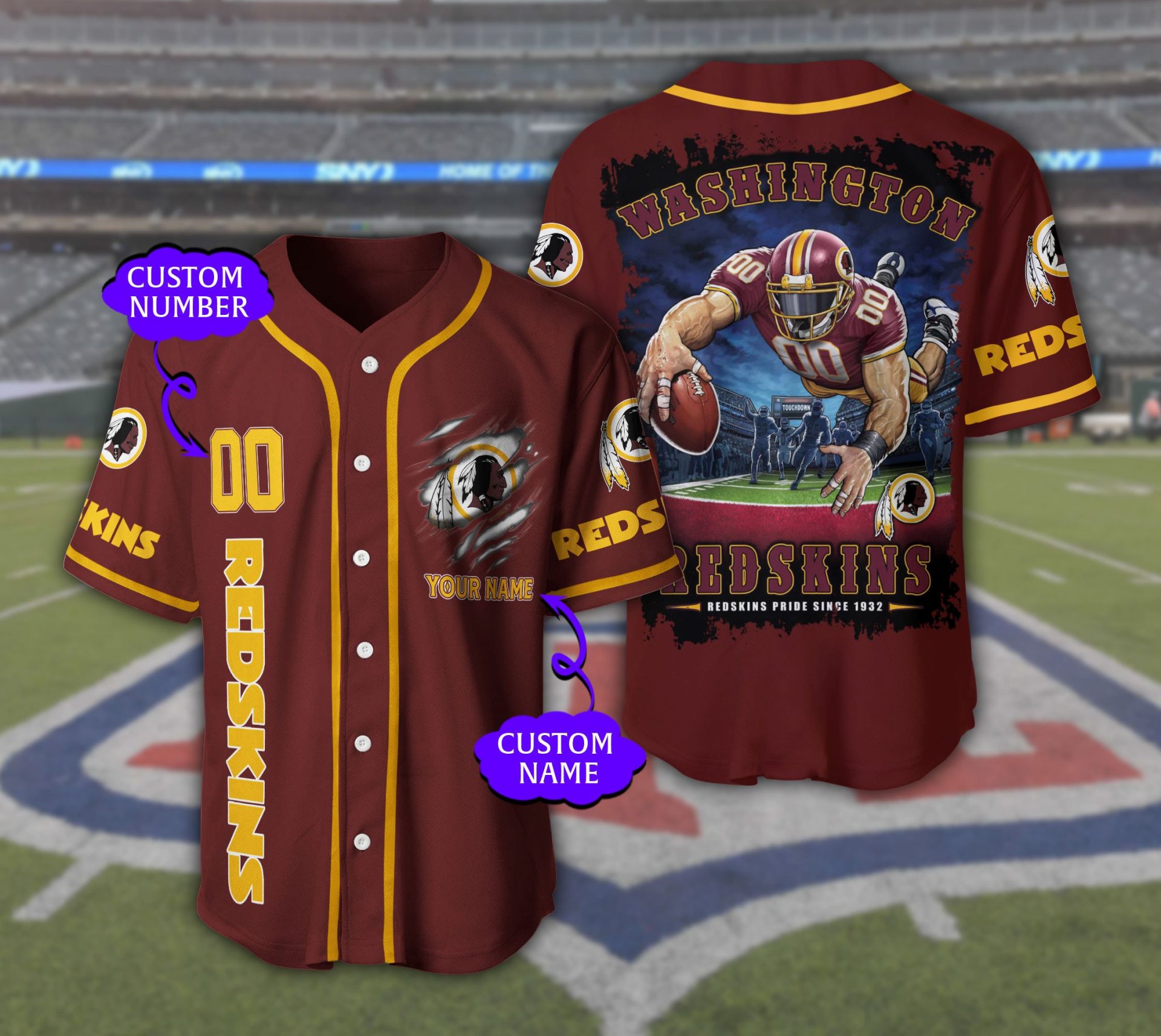 NFL Washington Redskins Custom Name Number Baseball Jersey Product Features This Washington Redskins Baseball Jersey is not only sturdy and durable for long hours of exercising, but also breathable and moisture-wicking to keep you snug all day. Breathable fabric: This Baseball Jersey is made of woven fabric, with moisture-wicking features and a comfortable feel to...
