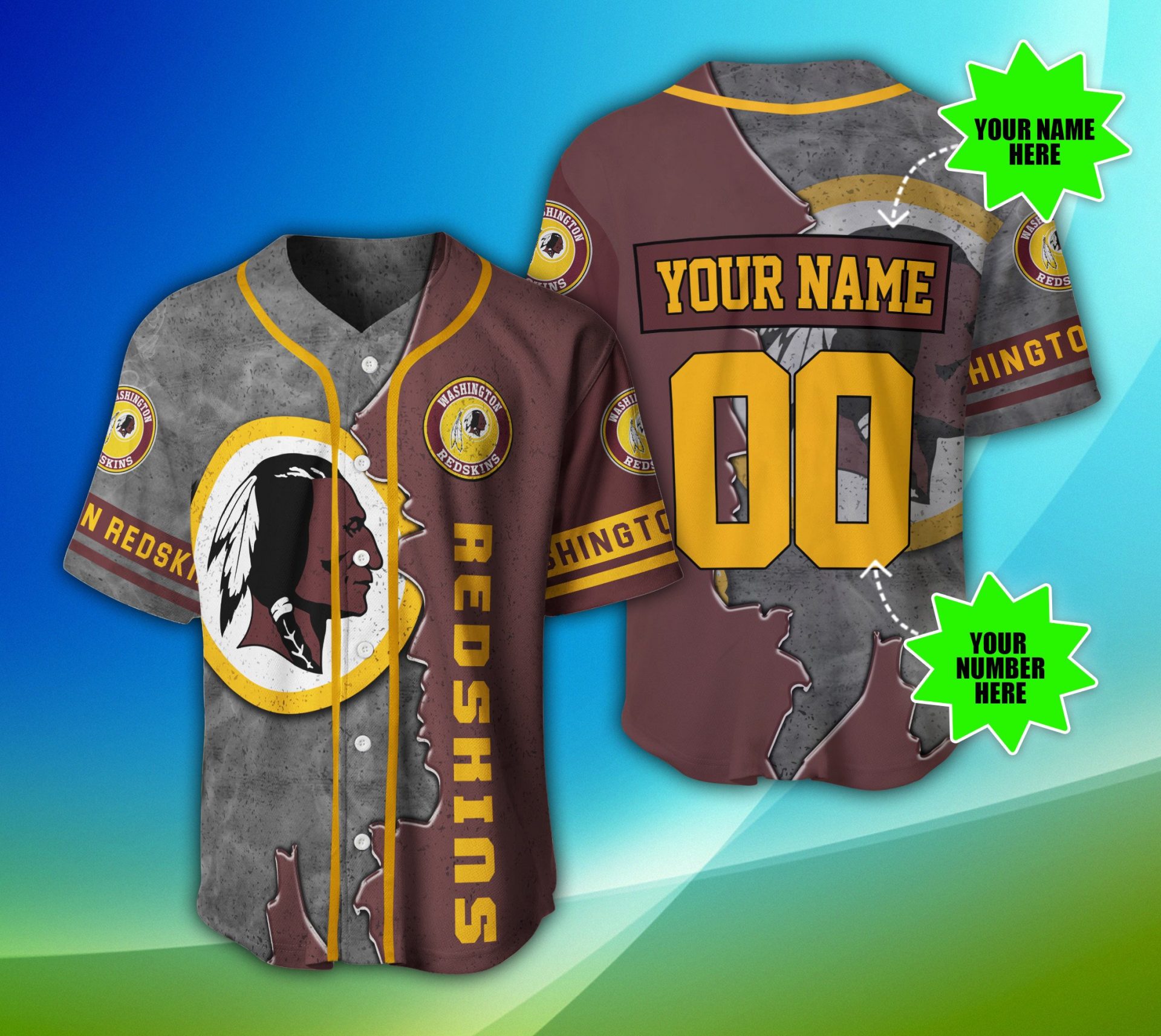 NFL Washington Redskins Custom Name Number Grey Brown Baseball Jersey Product Features This Washington Redskins Baseball Jersey is not only sturdy and durable for long hours of exercising, but also breathable and moisture-wicking to keep you snug all day. Breathable fabric: This Baseball Jersey is made of woven fabric, with moisture-wicking features and a comfortable...