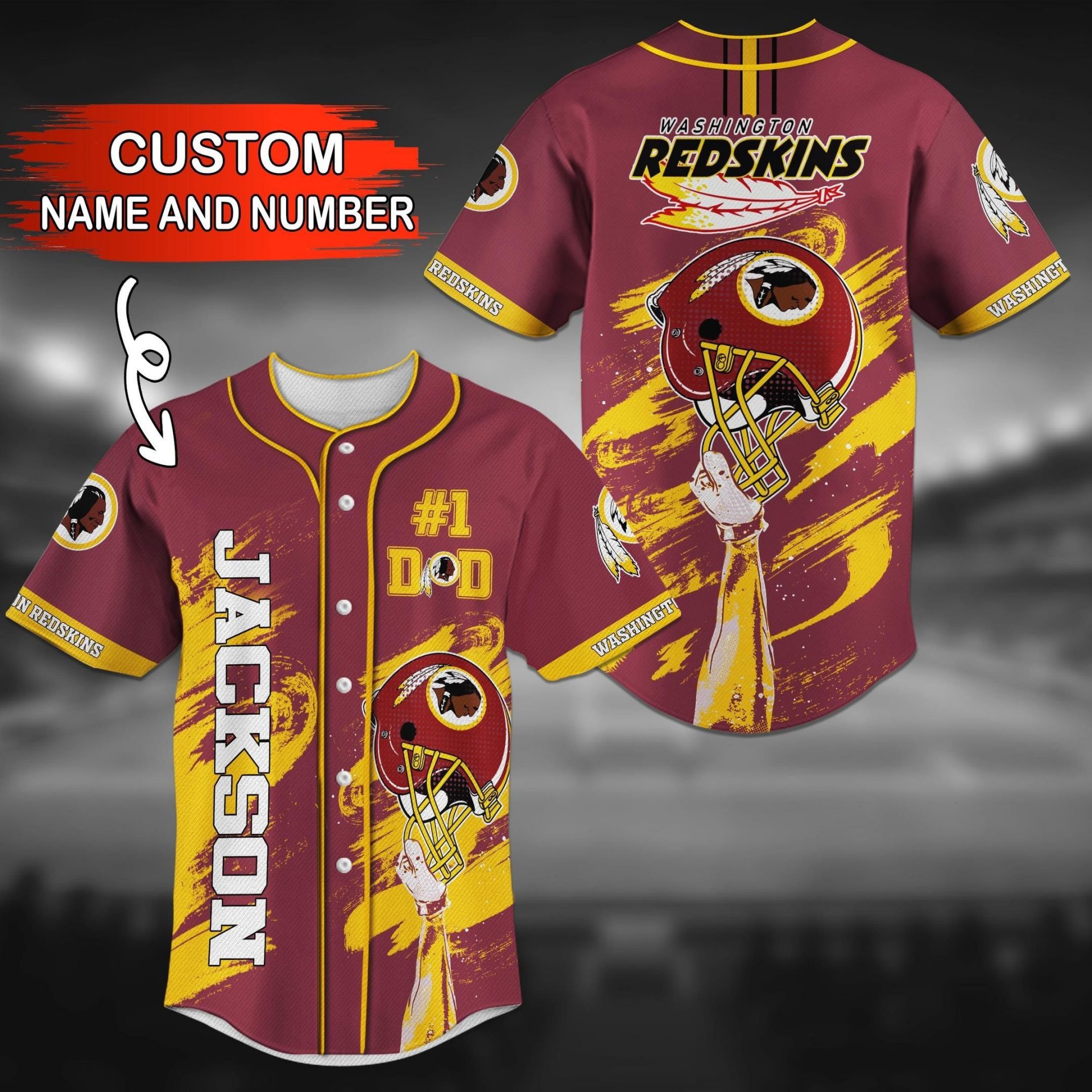NFL Washington Redskins Custom Name Number Logo Baseball Jersey Product Features This Washington Redskins Baseball Jersey is not only sturdy and durable for long hours of exercising, but also breathable and moisture-wicking to keep you snug all day. Breathable fabric: This Baseball Jersey is made of woven fabric, with moisture-wicking features and a comfortable feel...