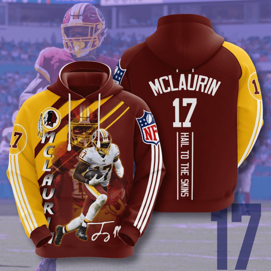 NFL Washington Redskins Terry McLaurin Burgundy Gold Stripes Pullover Hoodie Product Features Along with its Washington Redskins graphics, this cozy pullover hoodie features super-soft midweight material. Material: 95% polyester + 5% spandex. The fabric is durable and resistant to wrinkles, shrinking and mildew. Hood with drawstrings. Long sleeve. Front pouch pocket. Midweight hoodie suitable for...