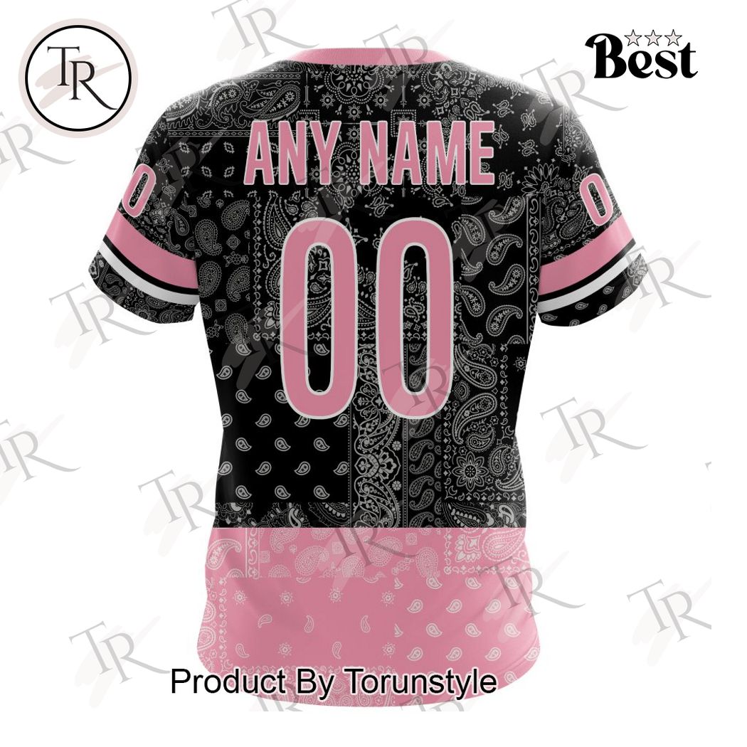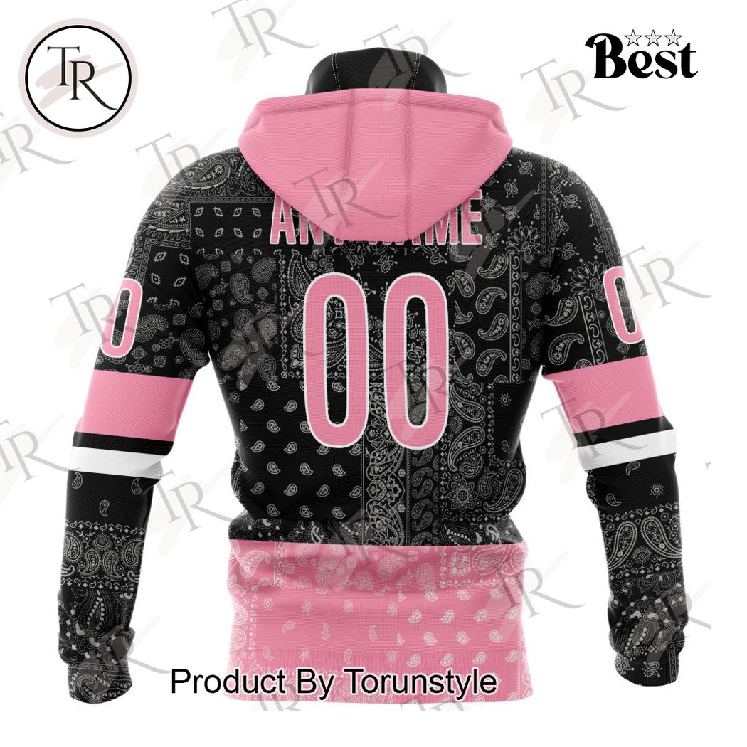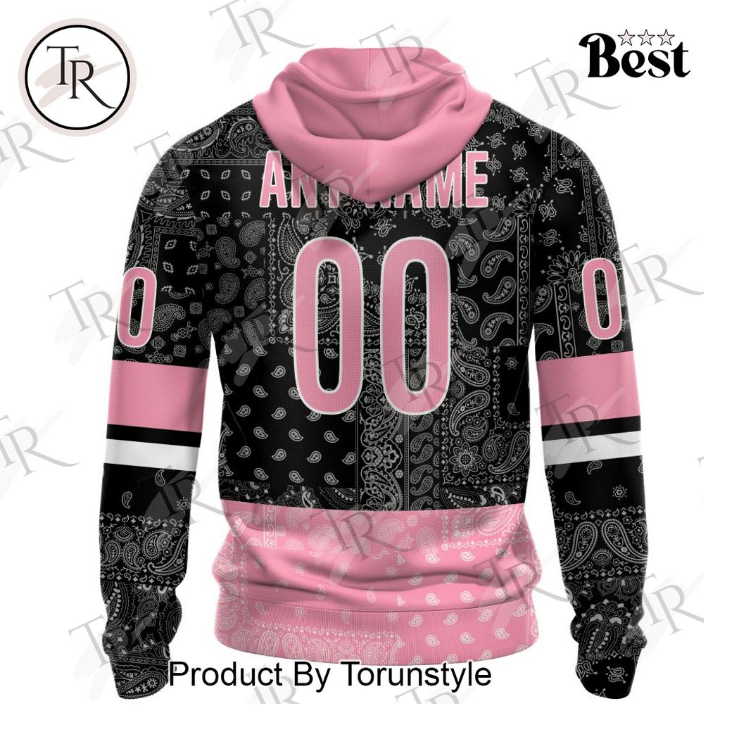 Embrace the vibrant spirit of Carolina Hurricanes hockey with this exquisite Pink Paisley Design Hoodie. Crafted with meticulous attention to detail, this garment embodies the team’s fierce passion and unwavering determination. The captivating paisley pattern, rendered in a striking shade of pink, evokes a sense of bold individuality and vibrant energy. Its soft, luxuriously textured fabric envelops you in unparalleled comfort, making it an ideal companion for cheering on your beloved Canes at the arena or simply showcasing your team pride in everyday life. This is not just a hoodie; it’s a statement piece that reflects your unwavering loyalty and celebrates the electrifying atmosphere of Carolina Hurricanes hockey. Wear it with pride and let your allegiance shine through, as you become an embodiment of the team’s spirit.
