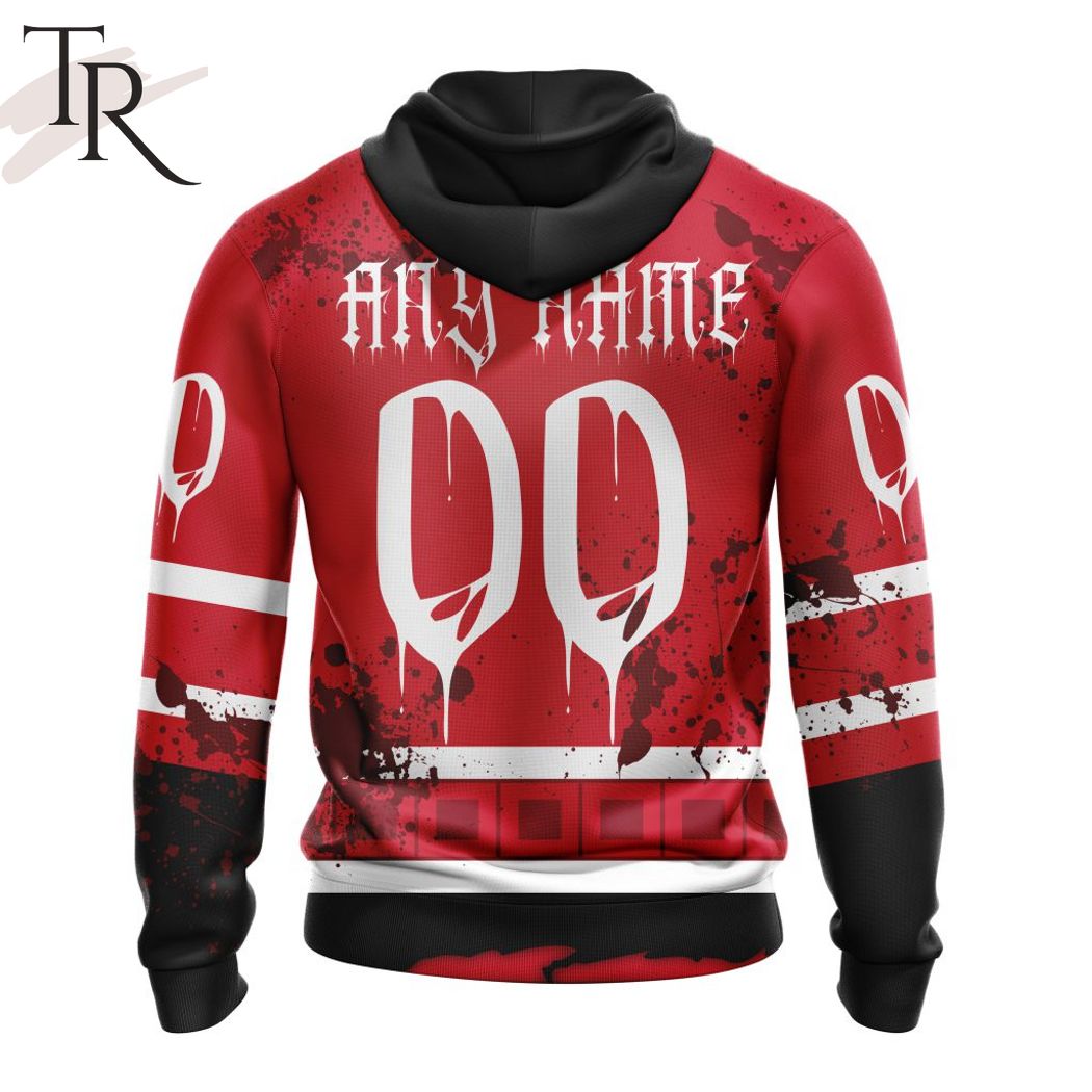 The NHL Carolina Hurricanes Specialized Design Jersey With Your Ribs For Halloween Hoodie is an essential piece of apparel for hockey fans and athletes. It features a comfortable construction that provides plenty of ventilation. The breathable fibers are perfect for all-day wear, and the hoodie is designed with reinforced stitches to ensure durability. The jersey’s design features a detailed Carolina Hurricanes crest and team colors, making it the perfect choice for displaying team pride. It’s also prominent with custom rib designs as part of the Halloween celebration, giving off a unique and festive look. This hoodie is the perfect way to show your hockey spirit while staying comfortable and fashionable.