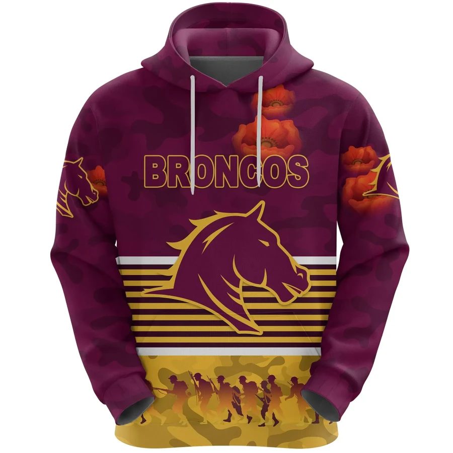 NRL Brisbane Broncos ANZAC Day Maroon Pullover Hoodie Product Features Along with its Brisbane Broncos graphics, this cozy pullover hoodie features super-soft midweight material. Material: 95% polyester + 5% spandex. The fabric is durable and resistant to wrinkles, shrinking and mildew. Hood with drawstrings. Long sleeve. Front pouch pocket. Midweight hoodie suitable for moderate temperatures....