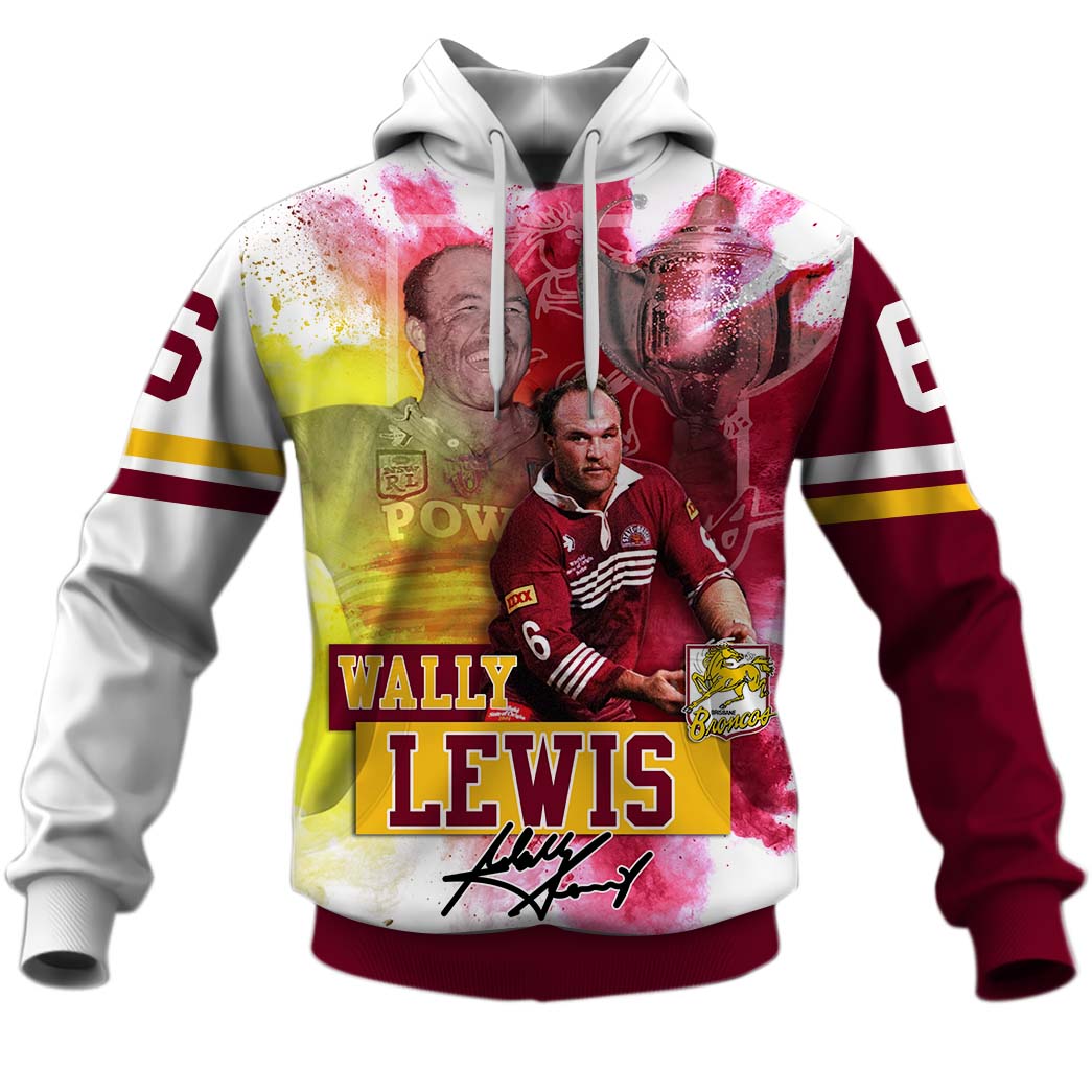 NRL Brisbane Broncos Legend Wally Lewis Pullover Hoodie Product Features Along with its Brisbane Broncos graphics, this cozy pullover hoodie features super-soft midweight material. Material: 95% polyester + 5% spandex. The fabric is durable and resistant to wrinkles, shrinking and mildew. Hood with drawstrings. Long sleeve. Front pouch pocket. Midweight hoodie suitable for moderate temperatures....